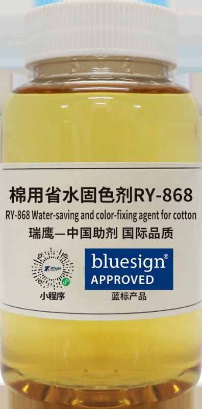 Suitable for fixation after dyeing or printing with direct and reactive dyes on cotton, linen, viscose,and other fibers. BluesignR approved product comply with EU Oeko-TexR Standard 100 requirements. Post-fixation wastewater is nearly clear, eliminating the need for multiple rinses after soaping, saving 3-5 cylinders of water, and reducing wastewater discharge by approximately 30%.
