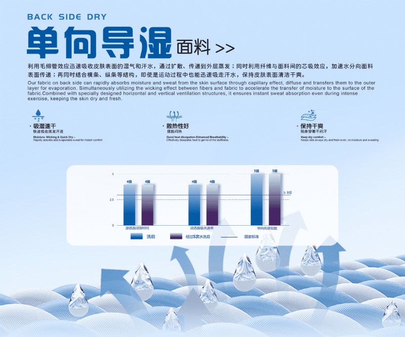 Our fabric on back side can rapidly absorbs moisture and sweat from the skin surface through capillary efect, diffuse and transfers them to the outer layer for evaporation. Simultaneously utilizing the wicking effect between fibers and fabric to accelerate the transfer of moisture to the surface of the fabric.Combined with specially designed horizontal and vertical ventilation structures, it ensures instant sweat absorption even during intense exercise, keeping the skin dry and fresh.