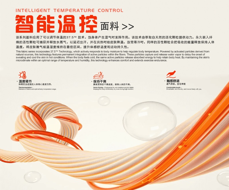 This fabric series incorporates 37.5 Technology, which actively responds to body moisture to help regulate boy temperature.Powered by acivated particles derived from natural sources.this technology features permanent intergration of active particles within the fibers. These particles capture and release water vapor to delay the onset of sweating and cool the skin in hot conditions.When the body feels cold, the same active particles release absorbed energy to help retain body heat. By maintaining the skin's microclimate within an optimal range of temperature and humidity, this technology enhances comfort and extends exercise endurance.