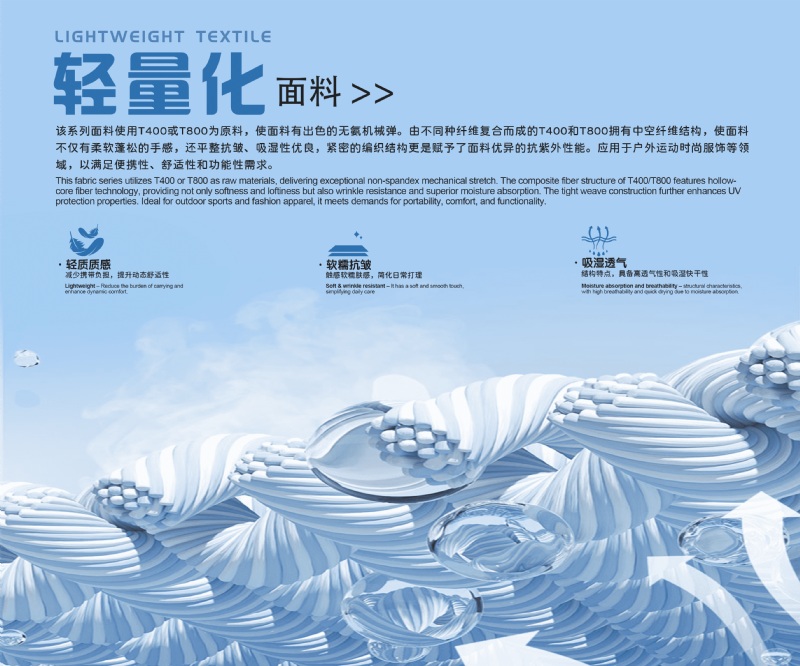 This fabric series utilies T400 or T800 as raw materials delivening exceptional non-spandex mechanical stretch. The composite fiber structure of T400/T800 feaTures holLow-core fIber technology, providing not only softness and loftiness but also wrinke resistance and superior moisture absorption.The tight weave construction further enhances UV protection properties. ldeal for outdoor sports and fashion apparel, it meets demands for portability, comfort and functtionality.